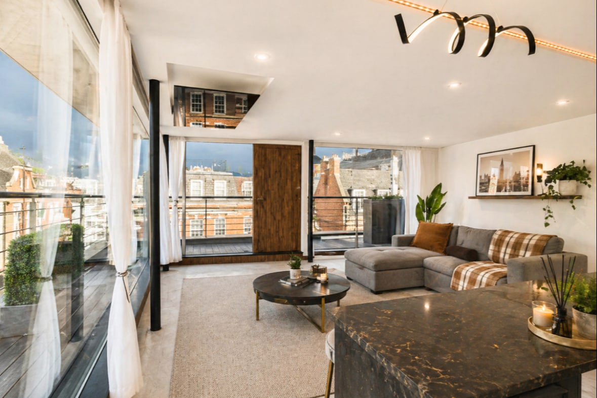 Aquest àtic es reparteix entre les dues últimes plantes amb accés a l'ascensor, amb finestres de terra a sostre que ofereixen unes vistes inigualables de tot Londres i portes corredisses que condueixen a una terrassa al terrat que envolta tota la planta superior. Comprèn una gran suite principal, un segon dormitori doble, un bany amb dutxa i una gran sala de recepció de cuina oberta amb un lavabo separat. Situat a Dean Street, està idealment situat al centre de Soho i a pocs minuts de bars, cafeteries i restaurants.