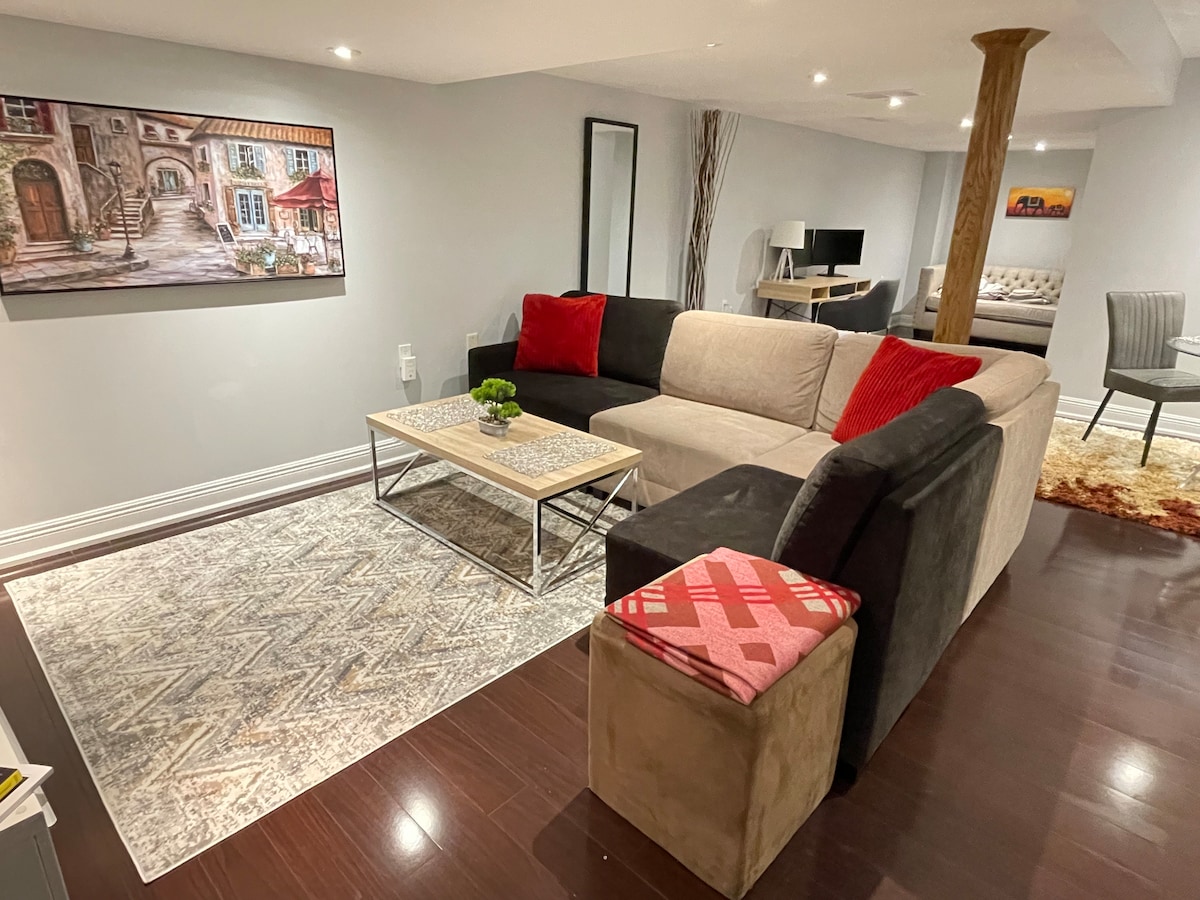 Suite privada de planta baixa de disseny elegant, en un barri tranquil i segur a GTA. Accés fàcil al transport públic, a poca distància de cafeteries, botigues de queviures i a 10 minuts en cotxe de Canada Wonderland! Tant si ets a la ciutat per feina com per oci, aquesta suite de concepte obert està dissenyada per a la comoditat, amb ✔️ un dormitori acollidor bany ✔️ modern amb una dutxa de luxe amb pluja cuina nova ✔️ ben equipada per preparar àpats fàcilment ✔️ menjador i estació de treball ✔️ Wifi i televisor intel·ligent amb Netflix ✔️ Un aparcament gratuït