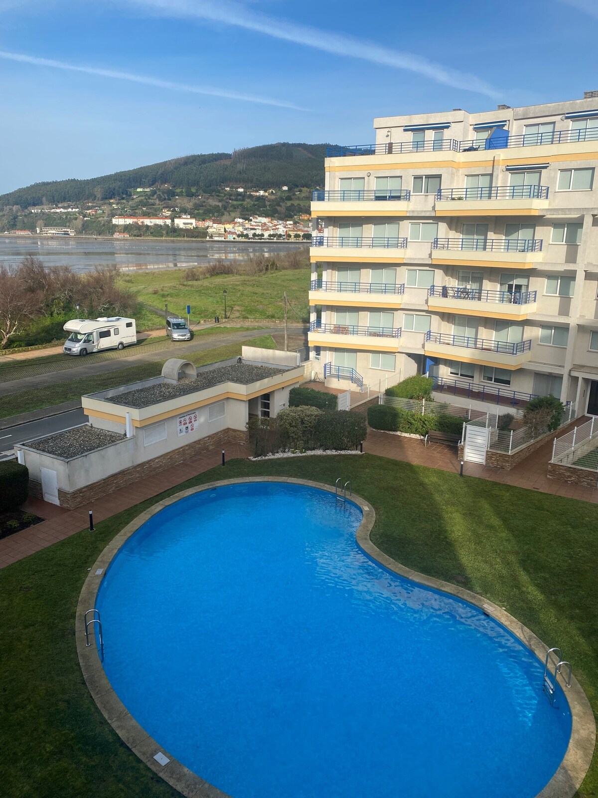 A la primera línia de la platja de Cedeira, al passeig marítim, molt lluminosa, amb vistes impressionants de la platja de Cedeira i el camp que envolta la casa, un pis nou i molt còmode, totalment equipat, en una urbanització amb piscina, gimnàs, jacuzzi i sauna, pistes de pàdel i frontenis. Té una meravellosa terrassa moblada, amb vistes a la platja a la qual s'accedeix des d'una gran sala d'estar amb cuina americana totalment equipada, 2 dormitoris dobles i garatge a l'edifici.