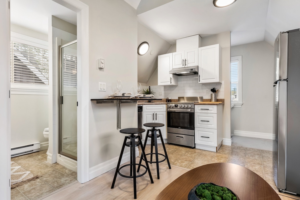 Aquesta suite privada d'espai obert es va crear a partir de l'antic estudi de ioga de la Jen, que es trobava a la nostra casa familiar, reutilitzant i reaprofitant materials sempre que era possible. Els terres de fusta recuperada condueixen a una terrassa a la vora del bosc Princess Park, amb un rierol de salmons que corre cap a l'oest. Sovint hi passen animals salvatges: osos rentadors, mussols i, de tant en tant, fins i tot un os. Algunes de les millors rutes de ciclisme de muntanya de North Shore són a un bloc. Un refugi tranquil i únic dissenyat per al descans, la privacitat i la natura.