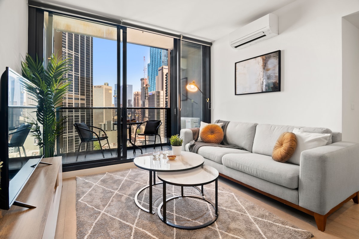 Un espai tranquil per sentir-te com a casa mentre ets a Melbourne, el teu propi apartament de 2 habitacions i 2 banys (interior de 64 metres quadrats + balcó de 6 metres quadrats). Dissenyat tenint en compte un santuari, modern i minimalista. Gaudeix de les increïbles vistes de l'horitzó de la ciutat. És un espai apte per a famílies. Situat al costat de l'estació Southern Cross i la terminal d'autobusos Sky. Situat a la zona de tramvia lliure, tot el que Melbourne té per oferir està al teu abast, a prop de restaurants barats, restaurants elegants i cafeteries de moda.