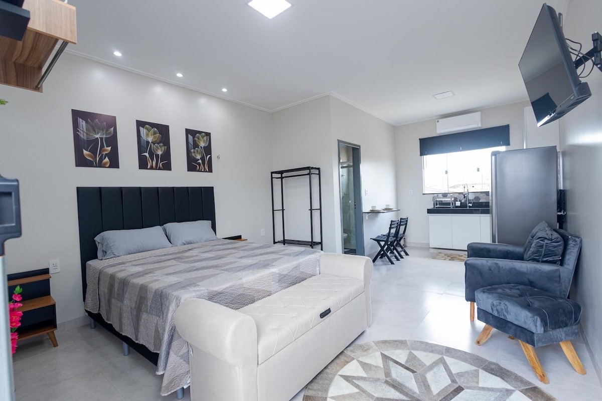 Perfecte per a parelles i viatgers, aquest modern loft en un edifici nou ofereix: ✅ ** Llit «KING SIZE»** (llençols de primera qualitat) ✅ **Piscina, gimnàs, zona de barbacoa i terrassa panoràmica ** ✅ **Wifi ultrarràpid** (fibra òptica) i **SmartTV amb Netflix** ✅ **Cuina totalment equipada**, rentadora i aire condicionat ✅ ** Articles de bany gratuïts** i elements bàsics Ubicació tranquil·la a **Blue Building (Rua dos Caripunas 1016)** – ideal per relaxar-se o treballar a distància!