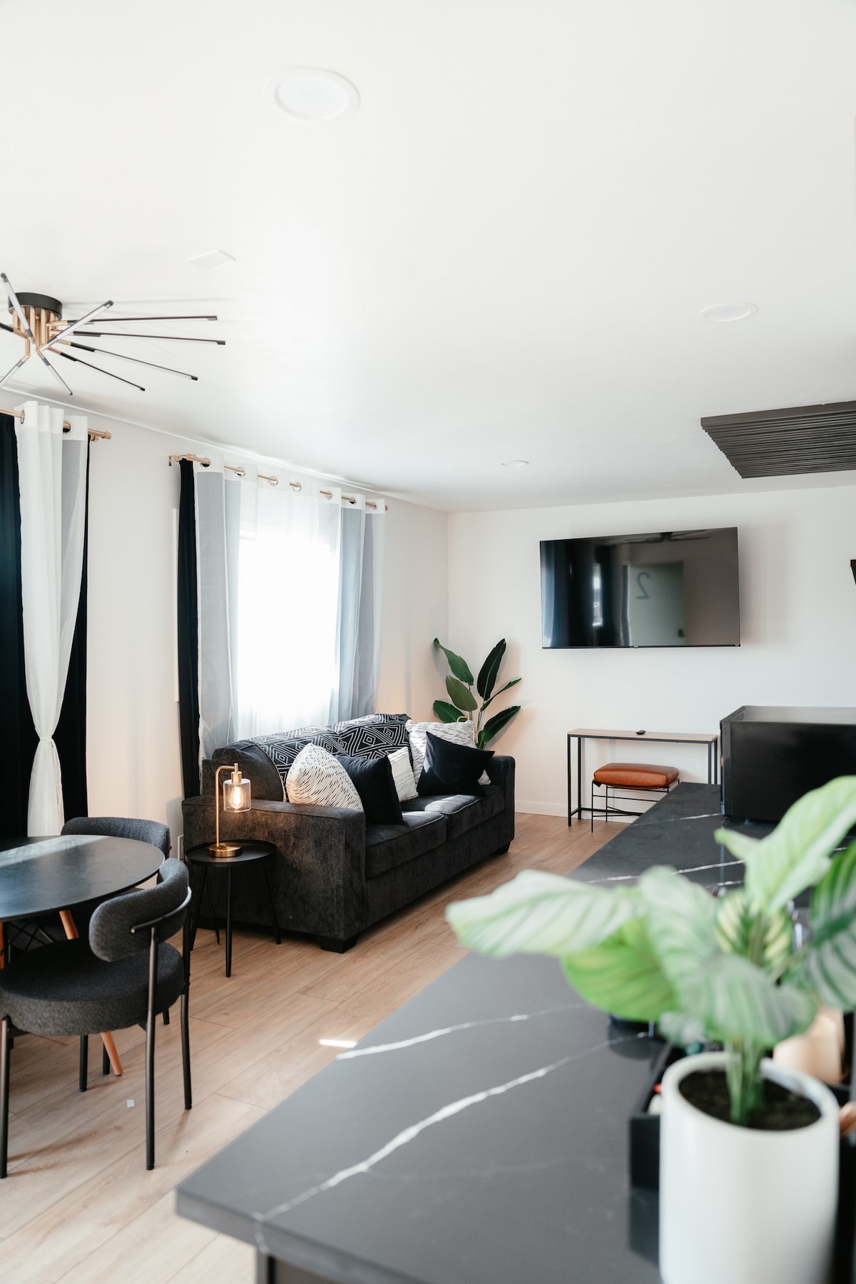 Torna a casa al teu estudi totalment equipat, suite d'un bany amb una cuina moderna amb electrodomèstics de mida completa, com ara nevera, rentaplats, microones, gamma, rebost i una illa de cuina. Amb una ubicació còmoda a cada unitat, la rentadora assecadora de mida completa està acompanyada d'una sala d'estar adornada amb elements de disseny moderns i mobles còmodes. El dormitori ofereix la màxima relaxació amb un llit king size, un esquema de color relaxant i un armari amb prestatgeries d'emmagatzematge eficients.