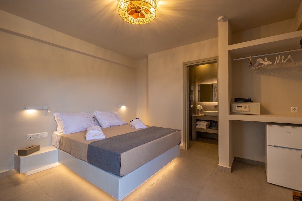 Semiramis Guesthouse Milos A només 130 metres del centre de la ciutat, la nostra Junior Suite, totalment renovada, és una suite de 24 metres quadrats amb instal·lacions modernes i està totalment moblada amb un llit doble (European King Size 160x200 cm) i un llit individual, televisor Netflix, una caixa forta i aire condicionat. La suite júnior podrà allotjar també 3 hostes amb un cost addicional del 15% del preu original com a doble. L'esmorzar és opcional no inclòs en el preu de l'habitació, és de 9 euros addicionals per persona.