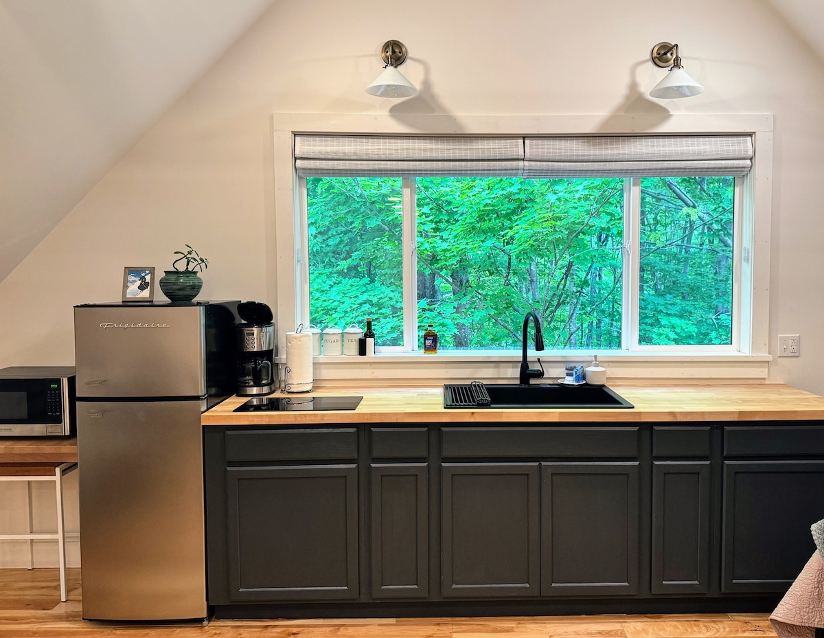 Acollidora suite d'hostes d'1 dormitori a la planta baixa a Lincoln, Vermont, amb bany, cuina petita, entrada independent i porxo amb vistes precioses a la muntanya. El dormitori té un llit «queen size». El bany té dutxa. La cuina petita té nevera petita, pica, microones, torradora, bullidor d'aigua elèctric, placa d'inducció de 2 cremadors. No hi ha fogons. La cafetera ve amb cafè acabat de moler de la VT Coffee Company i xarop d'auró de Lincoln 's Twin Maple Sugarworks.