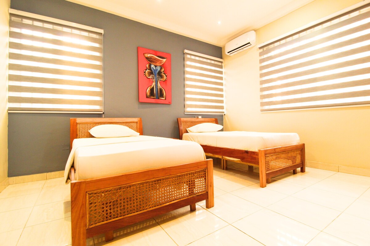 Relaxa't amb tota la família en aquest allotjament tranquil. Aquesta bonica casa d'hostes disposa de dos espaiosos dormitoris dobles, sala d'estar, cuina, bany i instal·lacions de rentat amb un ampli espai a l'aire lliure, gran connexió amb la ciutat. La casa de convidats es troba a poca distància del centre de la ciutat i dels llocs històrics d'Accra. Accra és una ciutat costanera amb accés a moltes platges, restaurants locals únics, clubs de polo i molt més. No t'oblidis de visitar els nostres mercats locals!
