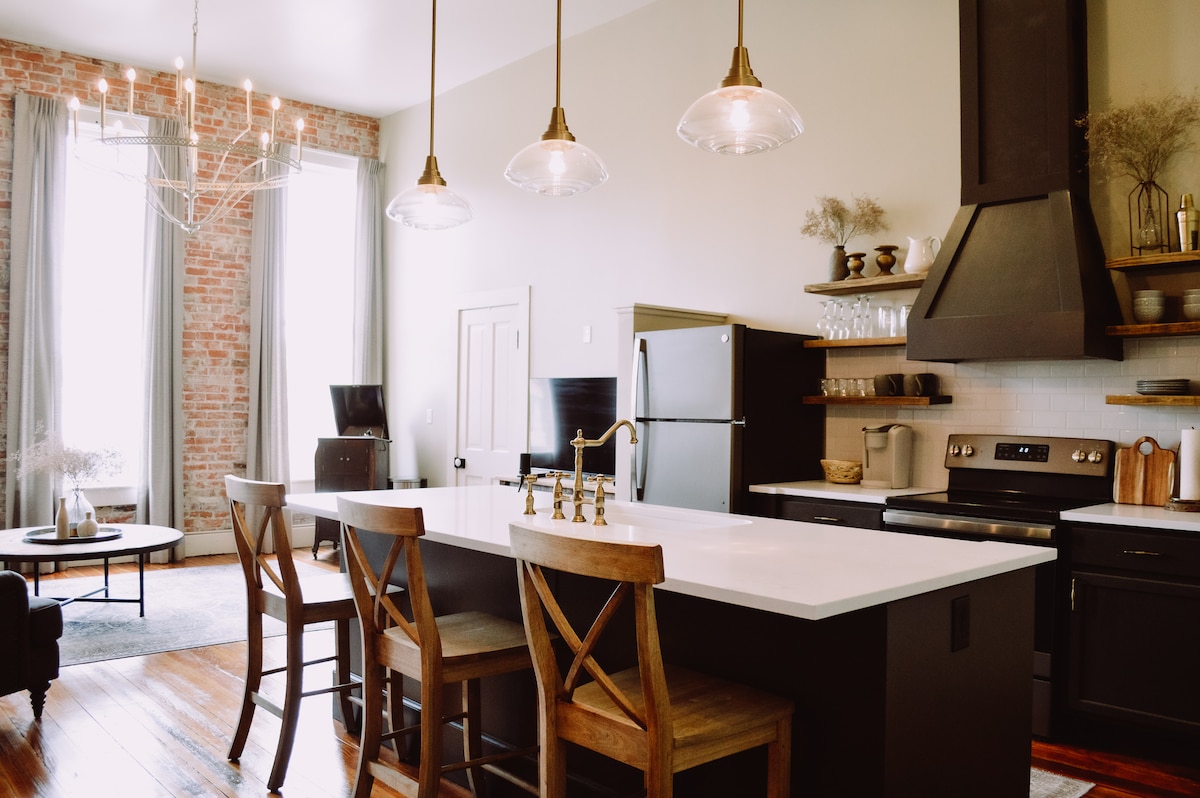 Construït el 1863, aquest romàntic loft 1 BR de segona planta compta amb els terres de fusta originals i la banyera amb potes amb dutxa. Gaudeix d'una escapada en parella a poca distància a peu del centre de Council Grove, Kansas. Després d'un dia d'exploració, torna a la graella amb els teus propis bistecs de Tiffany Cattle Company a la terrassa exterior! Gaudeix de l'estrès quotidià abans de adormir-te al llit de ferro forjat de mida queen. Gaudeix de wifi gratuït i d'equipament i serveis moderns, com ara un televisor intel·ligent, i allotja't tot el temps que vulguis!