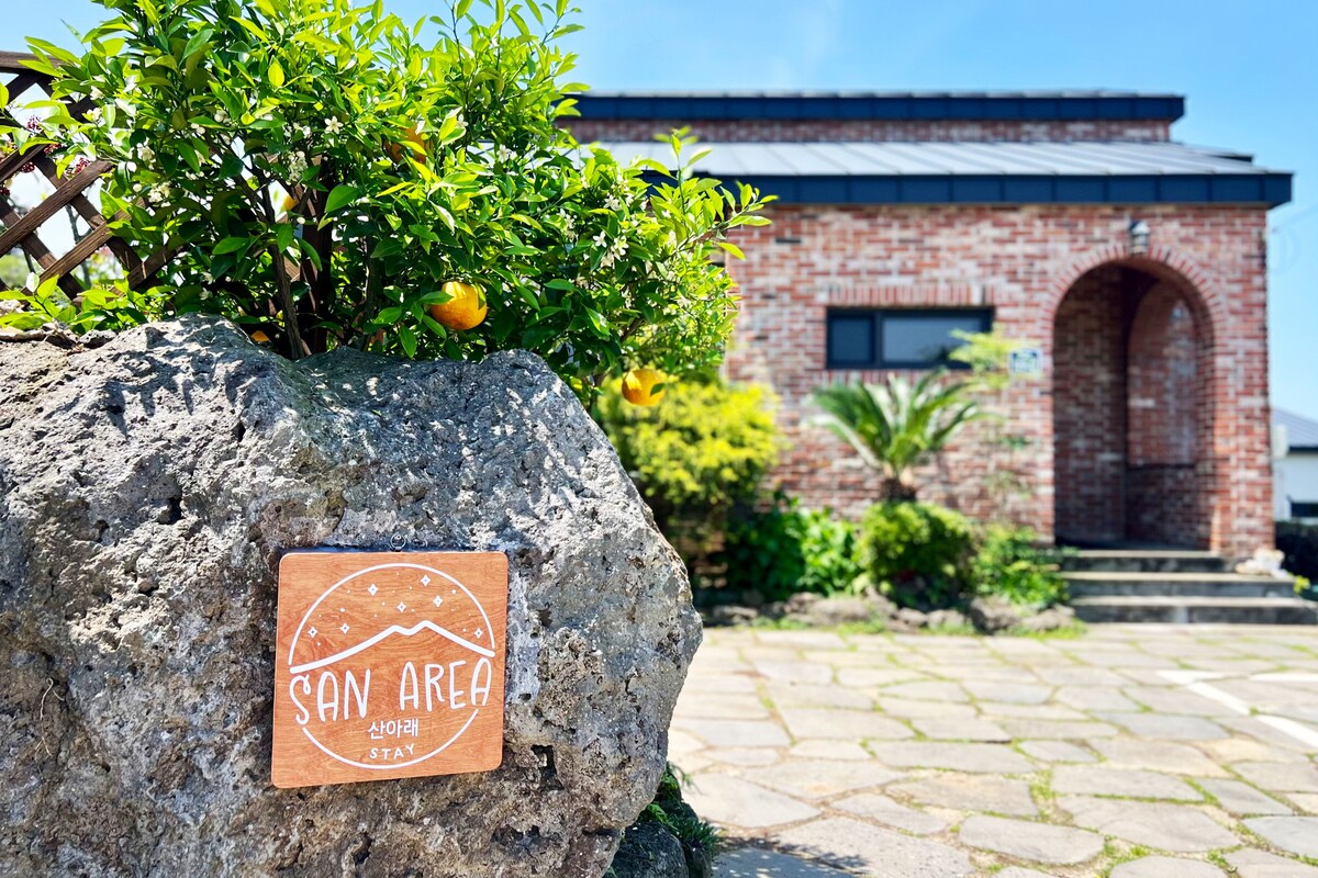 True to its name ("Stay Below the Mountain"), relax at our eco-friendly, custom-built "Red Brick House" while listening to the sounds of nature, right beneath Gunsan Oreum. Enjoy high ceilings, a cozy loft, and a private deck with Mt. Hallasan views & sunsets. ✨ 📍 Perfect Location • Located on Olle Trail (Route 9). • 3-min walk to Gunsan Oreum trailhead. • 2-min drive to the main road. 🔥 Amenities • BBQ, Fireplace (Bonfire), & Jacuzzi. • Stargazing at night. 💬 We are fluent in English!