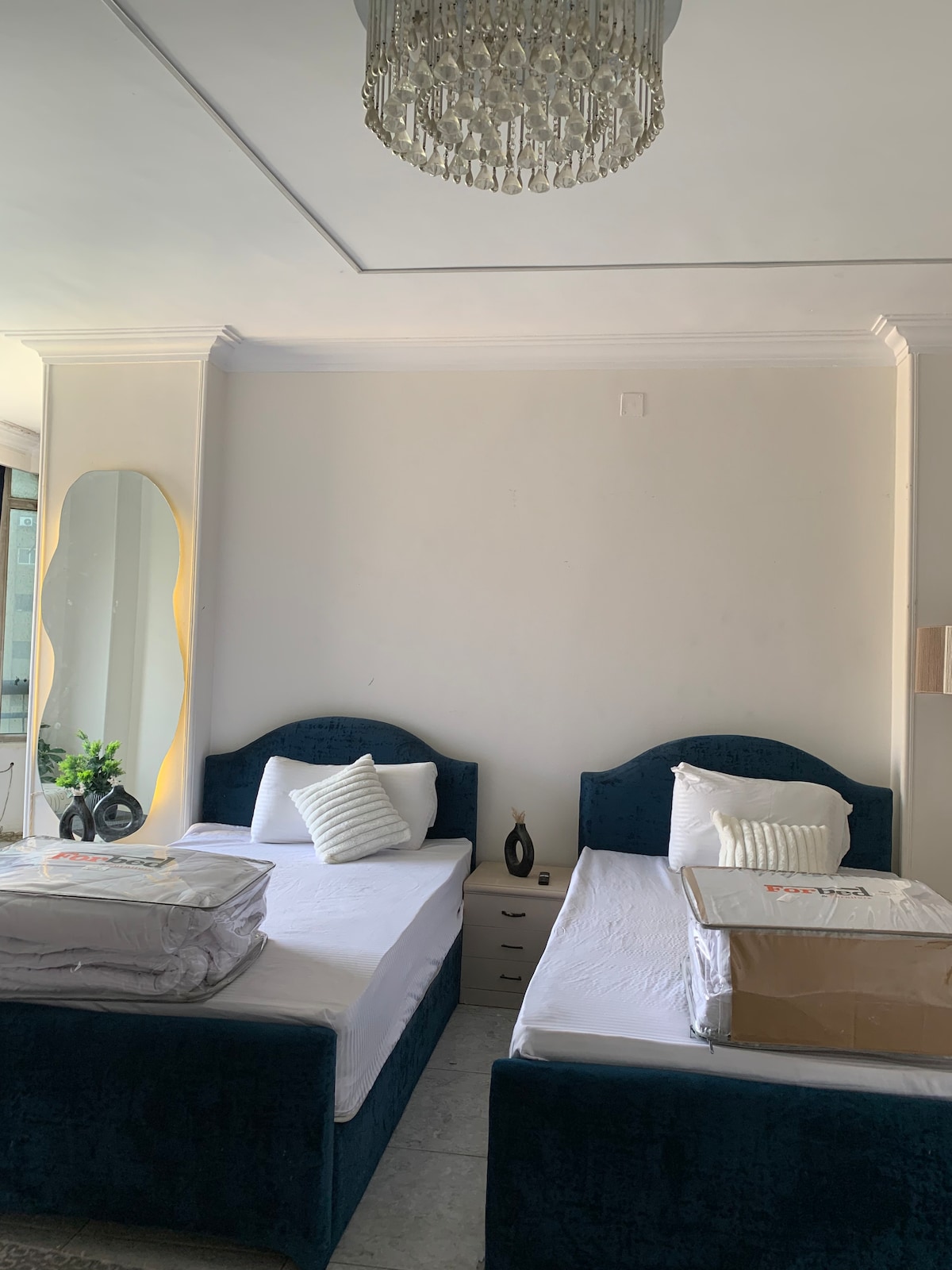 هذا المسكن الفريد له أسلوبه الخاص تصميمه نفس تصميم الغرف الفندقية بداخل الفنادق الكبري يتكون من سريرين بمراتب مريحه وملاية ابيض ولحاف ابيض حمام يحتوي علي سخان للمياة السخنه وبانيو للاسترخاء شاشة عرض 50 بوصه سمارت يوجد امن 24 ساعه اطلالة مميزة علي الشارع العام والاشجار 3 اسانسير مكيف ميني بار -بوتجاز صغير-ادوات الطعام- غلاية مياة-مكينة قهوه- يوجد سكر -شاي-نسكافيه-مياة مجانا واي فاي مجانا تنظيف مجانا غسل وكوي الملابس مجانا صابون يد مجانا (هذا المسكن لا ينقطع بها الكهرباء ابدا)