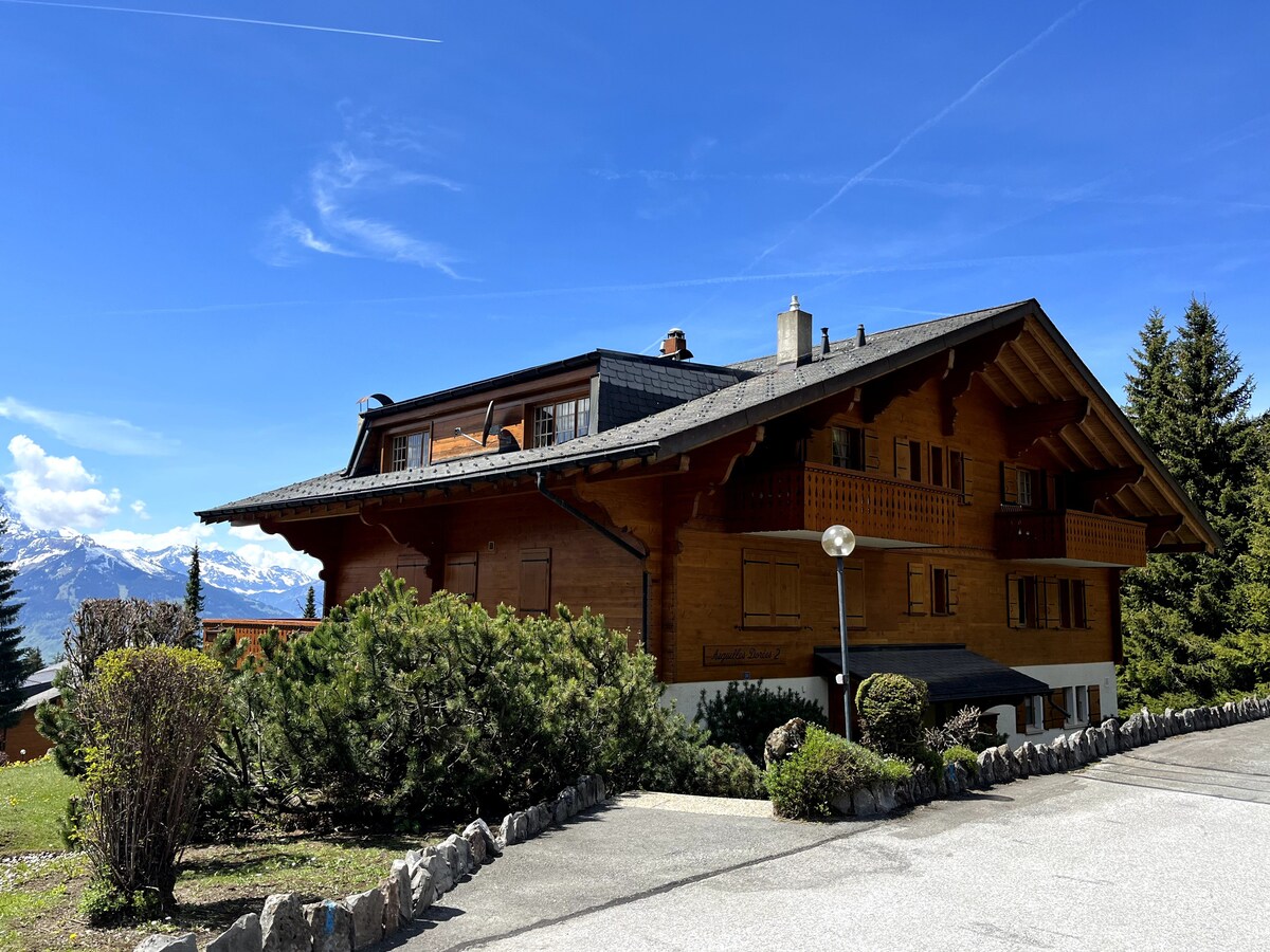 Pis tipus loft de muntanya a la planta superior d'un típic xalet suís amb sostres alts, unes vistes precioses i una gran terrassa. Situat al poble d'Alpes-des-Chaux, a 1 minut en cotxe / 10 minuts a peu de l'remuntador de Villars-Gryon-Les Diablerets. També per a nens, teleesquí gratuït amb pistes per a nadons i pistes de trineu molt a prop. A 7 minuts en cotxe de Barboleuse i a 15 minuts de Villars amb connexions regulars d'autobús (parada d'autobús a 100 m) A l'estiu, a 10 minuts a peu hi ha el punt d'inici de rutes de senderisme i un llac on es pot nedar.
