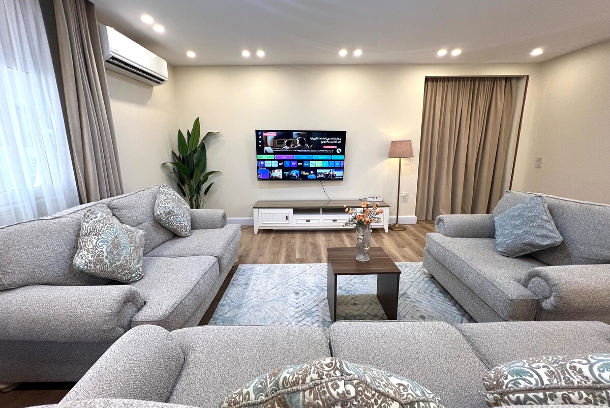 Gaudeix de l'última comoditat moderna al nostre nou apartament de 2 dormitoris i 1 sofà llit de 2 banys adequat per a 5 persones. Cada centímetre d'aquest elegant espai és nou i està dissenyat per fer que la teva estada sigui inoblidable. El nostre pis és perfecte per a famílies o un viatge de negocis. Trobaràs tots els serveis que necessites, com ara una cuina totalment equipada i una sala d'estar còmoda Situat en un lloc privilegiat, estàs a poca distància de restaurants,botigues a tagamoa i naser city Fes la reserva ara. Tenim moltes ganes d'allotjar-te!