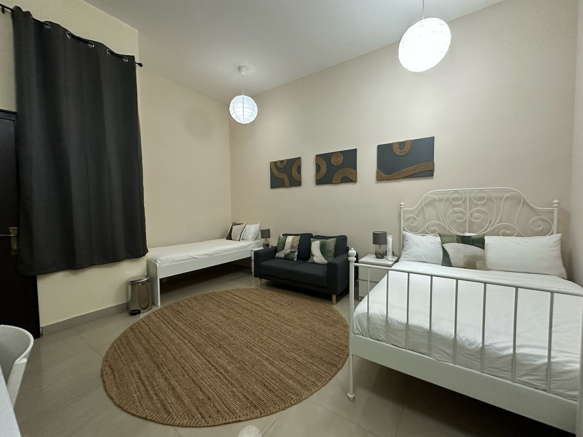 Acollidor i tranquil estudi privat dins d'una espaiosa vil·la, a només 3 minuts en taxi de la Universitat d'IA Mohamed bin Zayed. Perfecte per a hostes de trànsit, estades curtes o estudiants. Totalment moblat amb bany i cuina petita equipada amb cuina completa. Si vols, podem ajudar-te a organitzar el transport des de l'aeroport, visites a la ciutat, safaris pel desert i altres experiències per fer que la teva estada sigui encara més agradable. A prop de centres comercials, supermercats, restaurants i a només 10 minuts de l'aeroport AUH.