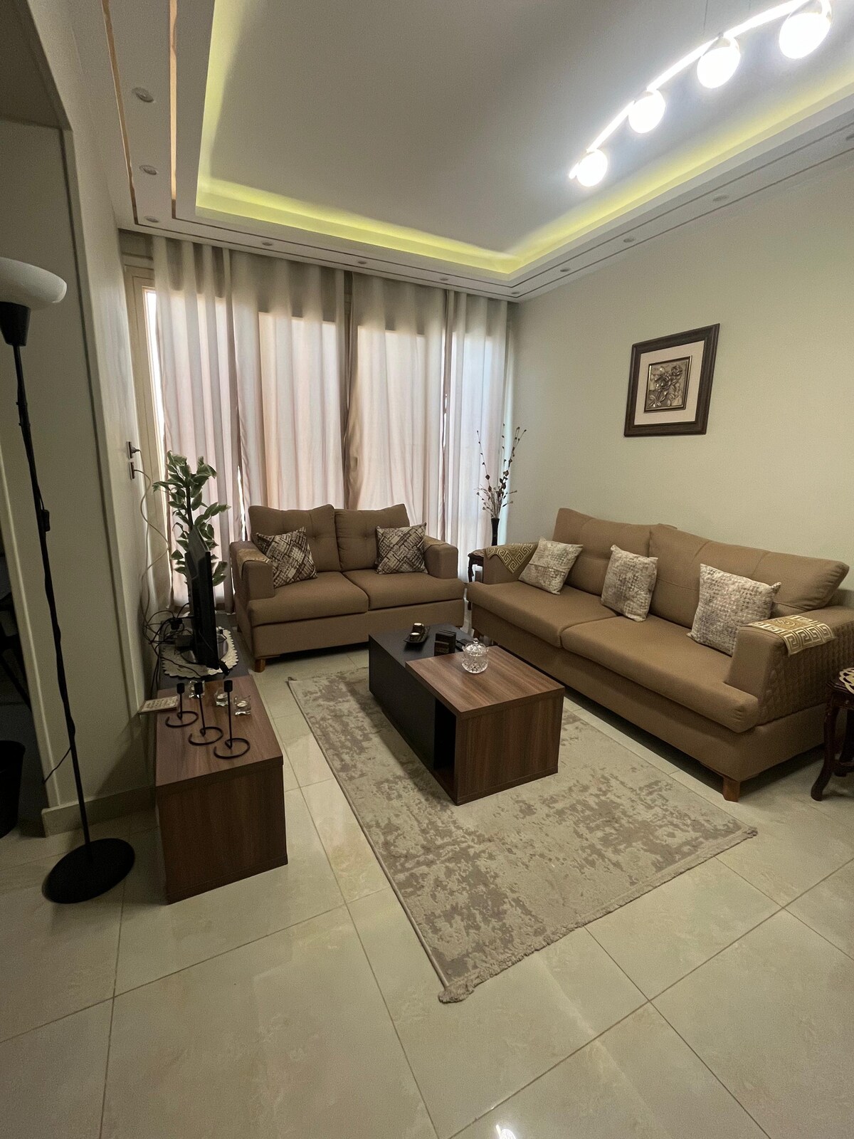 Gaudeix d'una residència elegant de dues habitacions al Caire, amb terres de marbre polit, interiors refinats i un ambient tranquil i acollidor on t'encantarà tornar. L'espai està dissenyat amb molta cura, amb línies netes, una il·luminació excel·lent i una sensació de comoditat en tot l'allotjament. La cuina està equipada per a tot, des de matins informals fins a nits relaxades, mentre que el sofà de felpa et convida a relaxar-te amb estil. Es té en compte cada detall per crear una estada relaxant i acollidora.