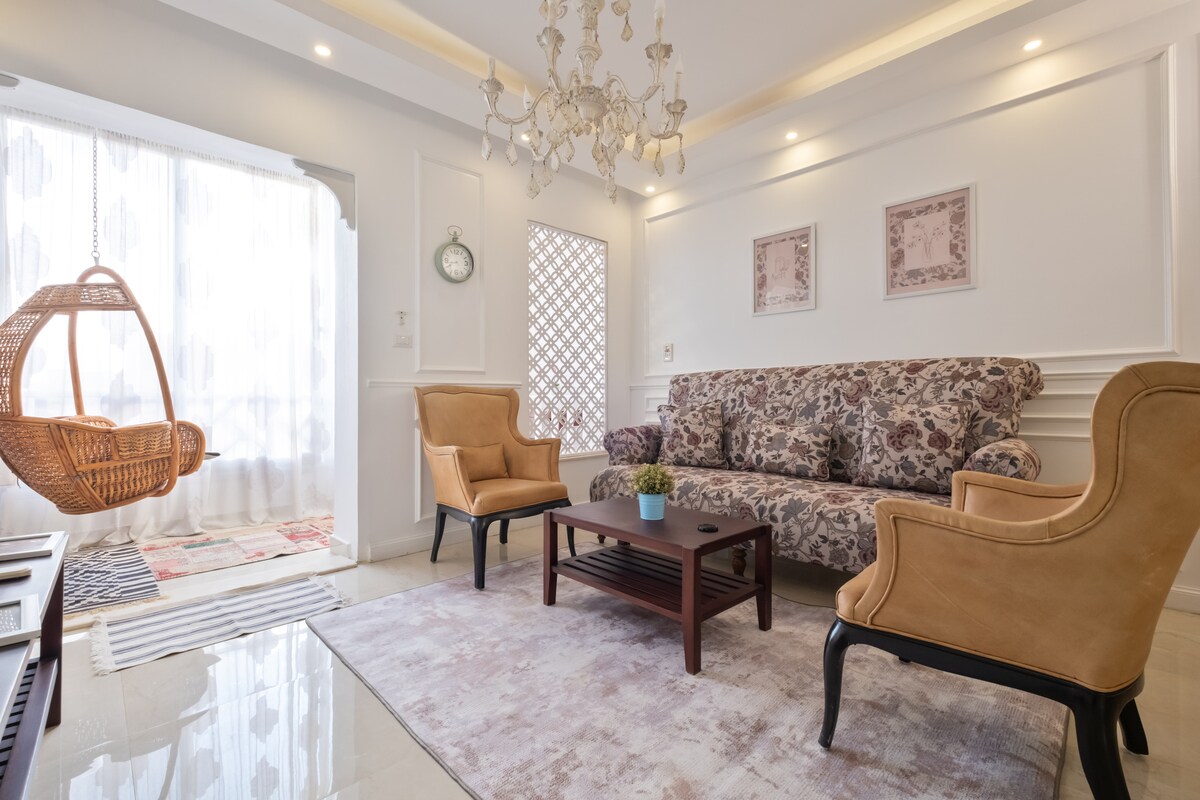 Pis lluminós i elegant a El Rehab que ofereix una estada relaxant. 🏡✨ La sala d'estar té llum natural i un balancí acollidor que penja del sostre 🛋️🌞. Gaudeix d'una zona de menjador acollidora, un dormitori còmode amb un llit «queen size» 🛏️ i dos dormitoris dobles per a famílies i grups 🛏️🛏️. L'allotjament inclou dos banys nets 🚿✨, una cuina totalment equipada 🍳☕ i dos balcons, un amb un gronxador penjant i un altre amb seients a l'aire lliure 🌿☕. Ideal per a estades tranquil·les en una comunitat segura i verda. 🌳🛡️