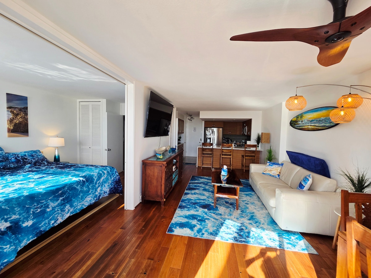 Vistes panoràmiques de l'oceà i de la costa! Convenient estudi a l'entrada de Waikiki. Caminades curtes a les platges i llacunes de Waikiki famoses a tot el món; Hilton Hawaiian Village on els focs artificials s'encenen cada divendres a la nit; el centre comercial a l'aire lliure més gran del món: el centre comercial Ala Moana amb música i espectacles hawaians diàriament gratuïts; el Centre de Convencions de Hawaii; i molts restaurants i activitats. Cuina amb taulell de quars, cuina segura i d'inducció ràpida. Còmode llit King size, escriptori, aparcament gratuït assignat.