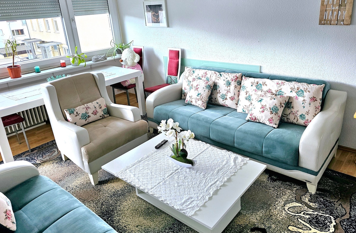 Willkommen in deiner liebevoll eingerichteten 2-Zimmer-Wohnung im Herzen von Ulm, nur wenige Schritte vom Ulmer Münster entfernt. Dich erwarten ein helles Wohnzimmer mit SmartTV, ein Schlafzimmer mit Kinderbett, eine Spiel-Ecke, eine schöne Loggia, eine voll ausgestattete Küche und ein modernes Bad. WLAN, Waschmaschine und Snacks sorgen für Komfort. In der Nähe gibt es zahlreiche Restaurants, Einkaufsmöglichkeiten und Parkhäuser – ideal für Urlaub oder Geschäftsreisen. Wir freuen uns auf dich!😊
