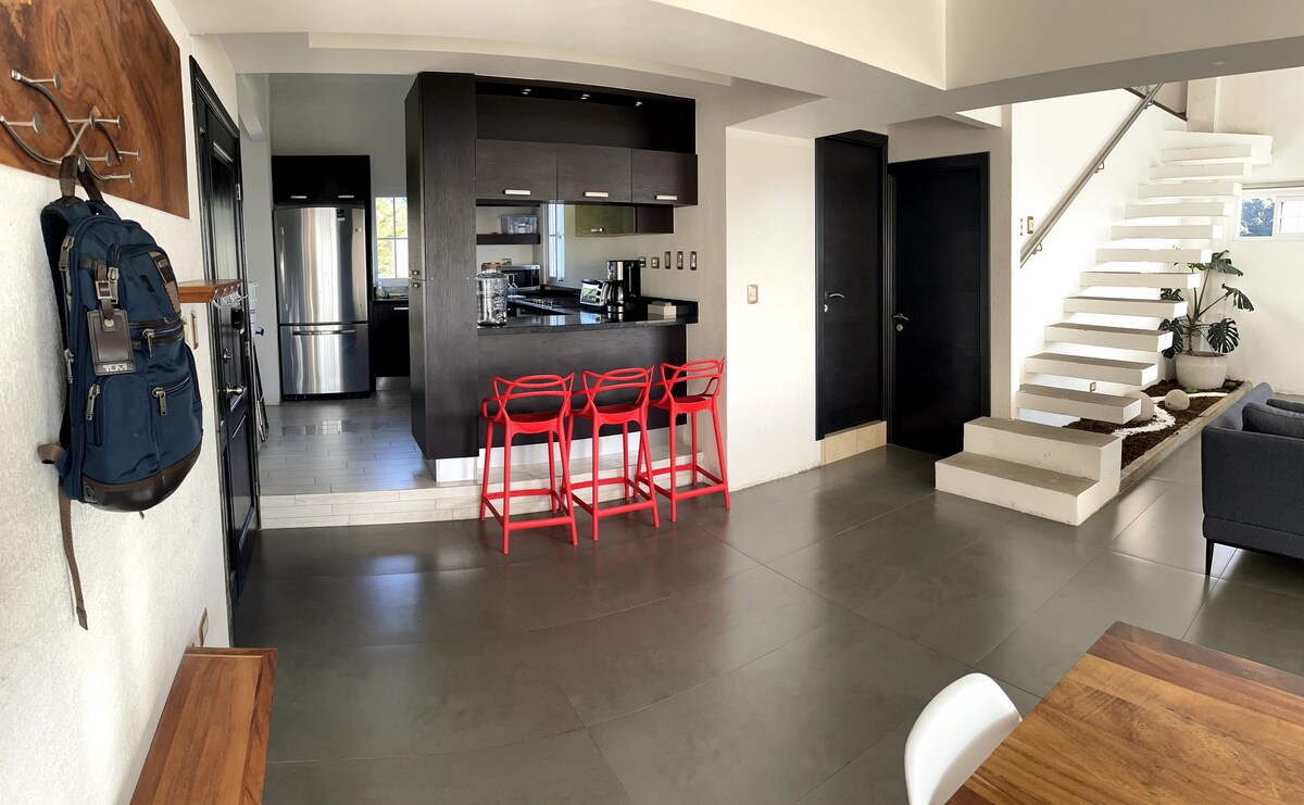 Imagina't estar envoltat de llum natural en un estudi elegant dissenyat per reconnectar amb tu mateix. Situat al cor de Muxbal, aquest espai ofereix serenitat sense desconnectar de la ciutat. Perfecte per a viatgers que busquen més que un lloc per dormir: aquí trobaràs estil, pau i funcionalitat. Disposem de parets panoràmiques amb vistes a Ciutat de Guatemala, els boscos de Muxbal i els emblemàtics volcans Agua, Fuego, Acatenango i Pacaya.