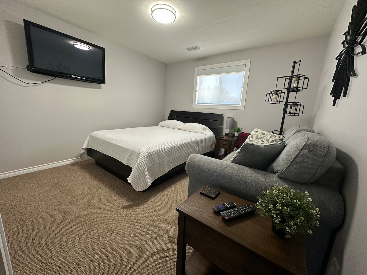 Aquesta moderna suite independent té tot el que necessites i molt més. Soterrani de dos nivells que ofereix grans finestrals. Cuina completa amb electrodomèstics i estris de cuina, espècies i condiments. Wifi d'alta velocitat per a totes les teves necessitats de streaming. Bany de 3 peces amb tovalloles, draps per a la cara, xampú, condicionador, gel de dutxa per a homes i dones, així com un assecador. Ubicació còmoda a prop de l'autopista amb botigues i restaurants a prop. Esperem que siguis el nostre hoste ben aviat.