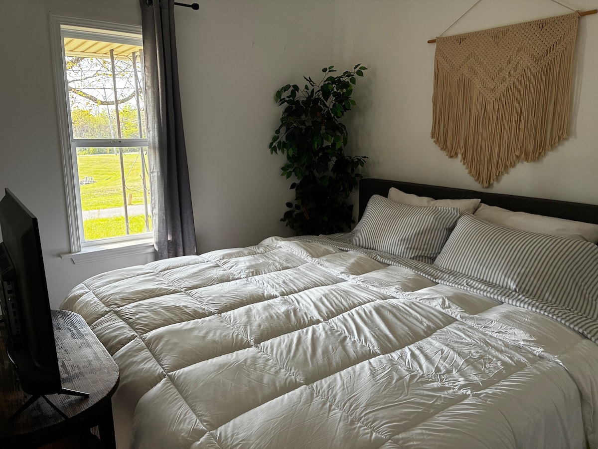 Et donem la benvinguda a la nostra acollidora caseta a la nostra pintoresca granja de 146 hectàrees. Escapa't a una caseta bellament remodelada que es troba dins dels turons ondulants d'una granja de bestiar. Ofereix vistes panoràmiques des dels porxos davant i darrere. Tant si només vols relaxar-te i gaudir del pintoresc entorn rural o explorar les atraccions properes, aquesta caseta renovada del 2023 és el teu refugi perfecte. Convenientment situat a només 10 minuts de Scottsville, a 15 minuts de Bowling Green i a 15 minuts del llac Barren River.