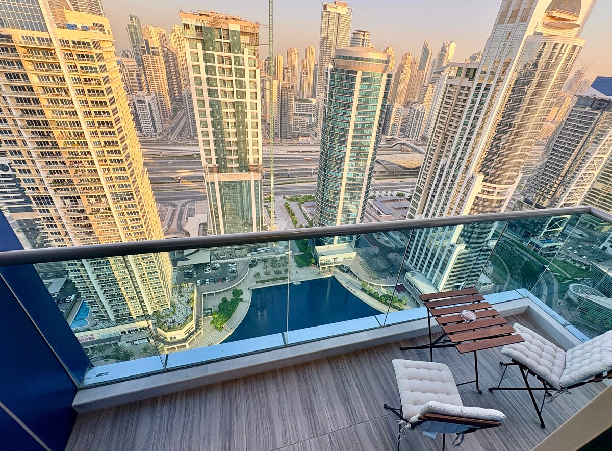 Et donem la benvinguda al teu allotjament a Jumeirah Lake Towers (JLT)! Aquest apartament modern està situat al centre de negocis de Dubai, envoltat de llacs plens de tranquil·litat. Ampli apartament de 2 dormitoris amb vistes panoràmiques al llac! Neda, fes servir el gimnàs i gaudeix de la neteja GRATUÏTA després de la sortida (setmanal per a estades llargues). Aparcament gratuït. Passeja fàcilment per restaurants, cafeteries i centres comercials. Camina fins a la parada de metro DMCC en 3 minuts i als restaurants en 2 minuts. El Dubai Mall és a 25 minuts amb metro. Perfecte per a famílies, parelles i viatgers de negocis: aquí trobaràs tot el que necessites.