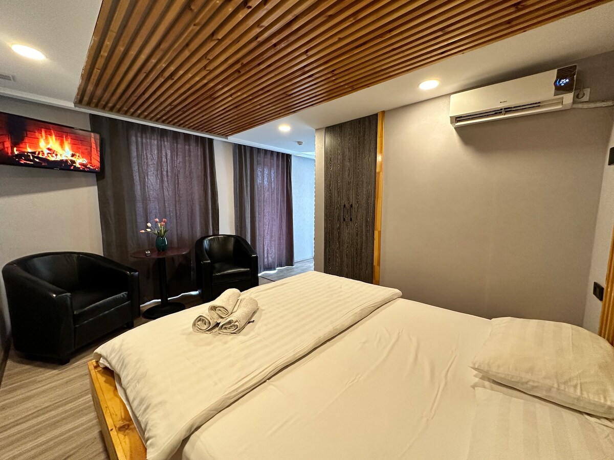 RESIDÈNCIA AIRIS | Hotel Premium al centre d'Almaty 32 habitacions còmodes per a viatges de negocis i de plaer. Cada habitació està decorada amb un estil modern i equipada amb tot el que necessites: Llit «king size» (180×200) amb roba de llit de primera qualitat - Aire condicionat - Caixa forta per guardar objectes de valor - Minibar i nevera - Bany amb dutxa - Joc complet de tovalloles, barnussos i articles de bany L'esmorzar de bufet està inclòs en el preu - Recepció les 24 hores
