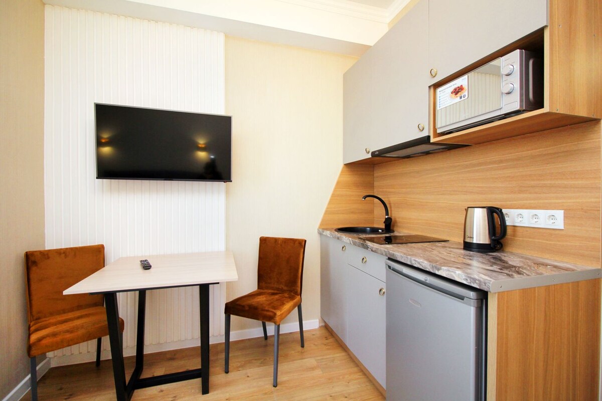 Apartaments de mini-estudi en una casa d'hostes. El concepte dels apartaments proporciona el màxim d'equipaments i serveis ubicats ergonòmicament a la zona mínima del pis, de 14 a 15 metres quadrats, que et permet aconseguir un cost de vida favorable per als hostes. Els apartaments estan dissenyats per a un allotjament còmode d'entre 1 i 2 hostes amb poc equipatge. Disseny interior de l'autor, districte tranquil del centre antic d'Alma-Ata, a poca distància a peu de 2 parcs,conjunt de cafeteries i centre de negocis.