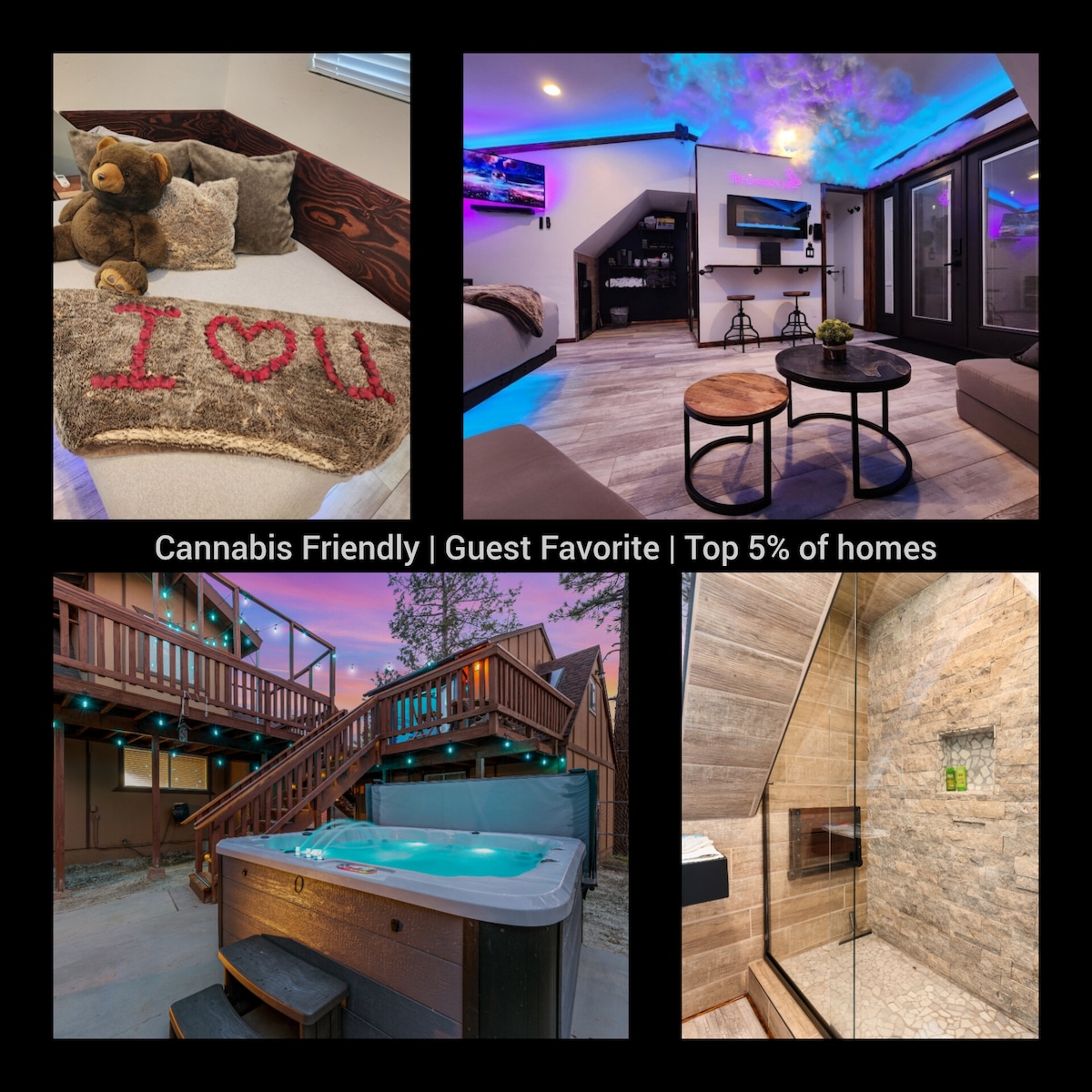 Bear Hugs és una acollidora cabina de concepte obert decorada amb mantes de llana de la badia de Hudson, mobiliari de restauració i mobiliari rústic personalitzat. Un refugi intel·ligent i nostàlgic, a pocs passos del llac, a pocs minuts a peu del poble i a pocs minuts en cotxe de les pistes, Bear Hugs ha sorgit com una joia estimada a Big Bear Lake. Gaudeix de la combinació perfecta dels avantatges i la privacitat d'un allotjament i un espai termal independents, combinats amb l'elegància, l'equipament i els serveis i la netedat d'un hotel pintoresc. LLICÈNCIA Bbl: VRR-2024-2883