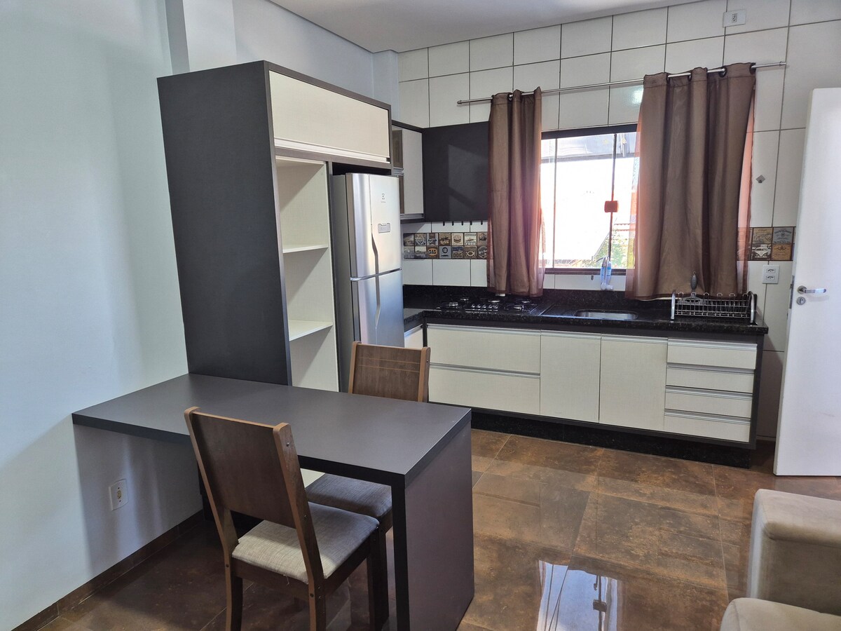 Apartament al centre d'Alta Floresta, amb llit de mida queen, aire condicionat, armari, cuina, microones, fogons, nevera, estris de cuina, capsa d'esmorzar, licuadora, cafetera, taula, bany, assecador, sofà llit, televisor, aparcament, molt acollidor i segur.