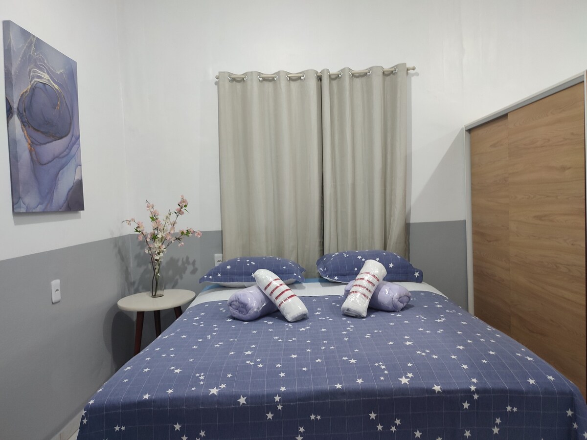Blau, inspirador i relaxant. Et convidem a gaudir d'aquest estudi de 25 m² totalment equipat, amb una ubicació privilegiada al barri d'Eldorado, en un carrer tranquil i segur, a prop de l'Arena da Amazônia, Ponta Negra i el centre històric i cultural de Manaus. Un espai acollidor i íntim, adequat per a la feina, el turisme i els dies de lleure. Ofereix un ambient tranquil i familiar, perfecte per a la teva estada: - Cuina equipada - Bany - Wifi - Televisor intel·ligent i aire condicionat. - Llit còmode