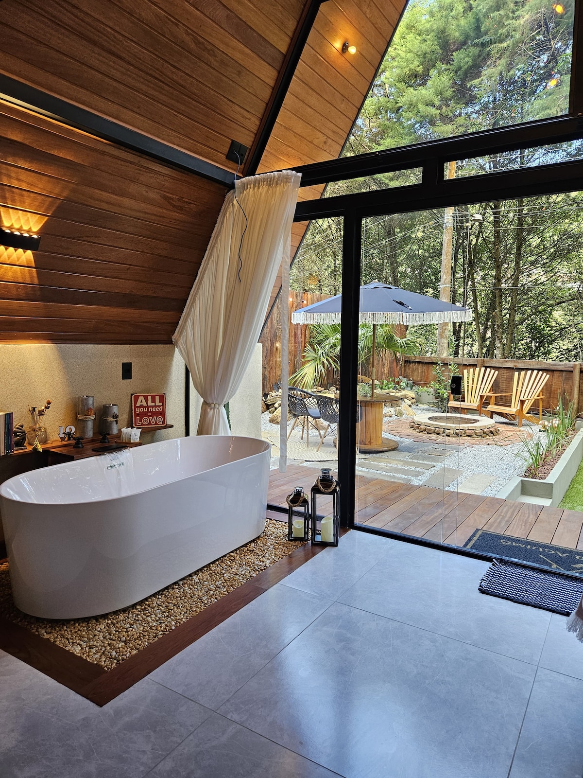 Aquesta caseta amb teulada a dues aigües, situada a les muntanyes de Carolina del Nord, és un refugi acollidor on el encant rústic es combina amb el confort modern. Els sostres alts de fusta i els finestrals del terra al sostre ofereixen unes vistes impressionants. Pren un cafè a la terrassa a l'alba, contempla les estrelles a la nit o comparteix una copa de vi a la llum de les espelmes. Una escapada de muntanya romàntica perfecta on la pau, l'estil i la natura es troben