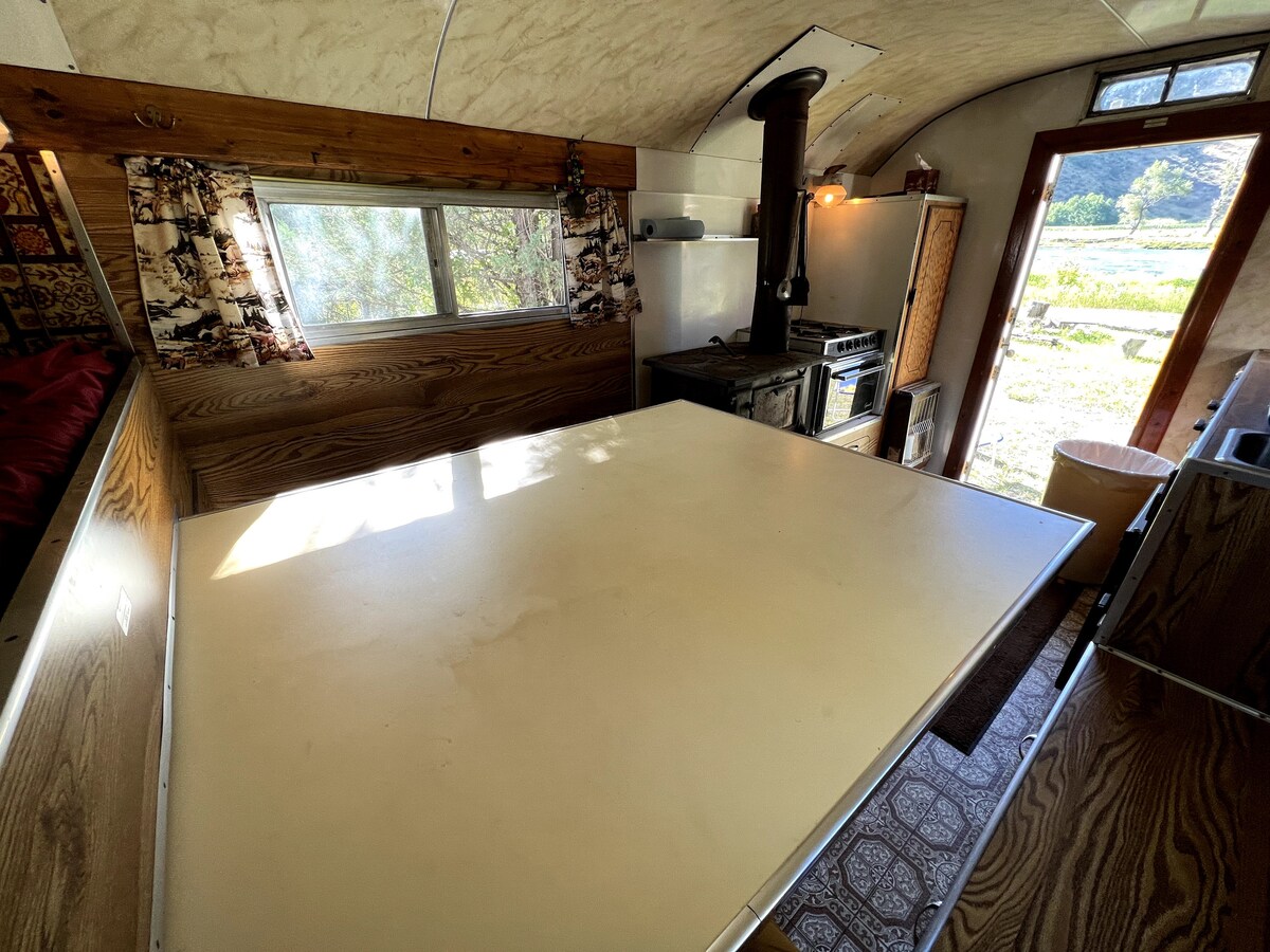 Cozy Sheep Wagon in Hoback Village, a Stargazer Cabin Community in true Dark Sky Territory. Off HWY 89, 40 min south of Jackson. Features a custom bed (best for smaller stature), mountain views, river access, and unbeatable stargazing. Enjoy full use of the community kitchen, grill, and picnic table, plus WiFi and a porta pottie. A unique glamping adventure! Enjoy a peaceful, affordable base to cook, relax, and take in Wyoming before falling asleep to the sounds of the Hoback River.