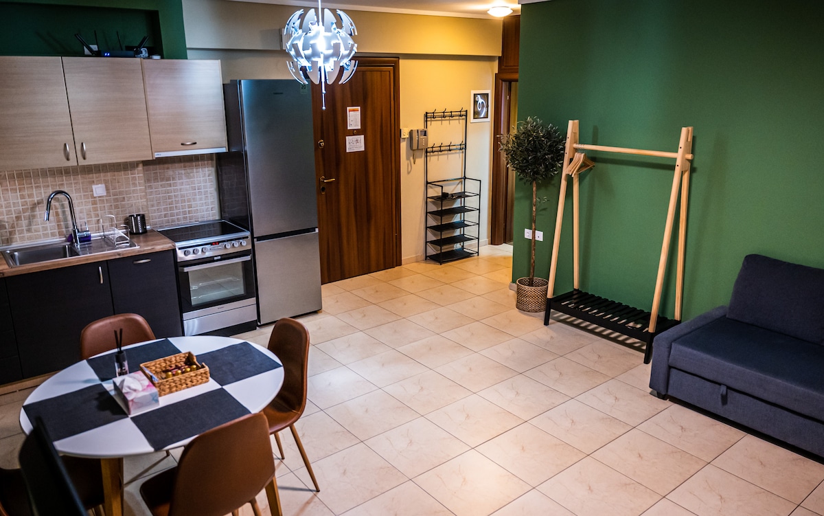 Stylish, pet-friendly apartment 100m from the Metro. Perfect for digital nomads, couples & small families exploring Thessaloniki. 🛏 Bright bedroom + sofa bed (sleeps 2) 💻 Windows PC, 1000Mbps Wi-Fi 📺 55" TV · Netflix, HBO Max, Disney+, Apple TV+, Prime — all pre-logged in 🍳 Full kitchen + espresso machine 🚗 Private parking available (small fee) 🐾 Pets welcome · Crib on request Self check-in · Elevator · AC · 1 min to Metro