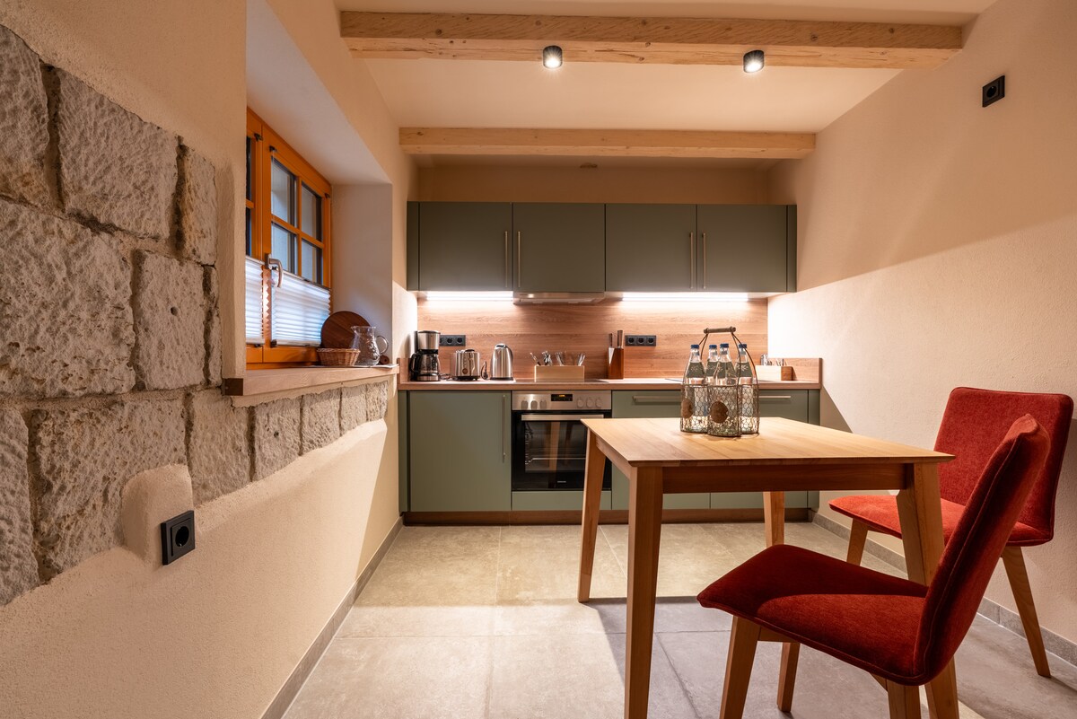 T'espera un apartament còmode i familiar amb cuina, sala d'estar, dormitori, dutxa i lavabo. L'apartament té capacitat per a 2 persones. A més, hi ha 2 opcions de llit addicional. S'ofereix un llit de viatge per als nens petits. Les habitacions estan pintades amb colors naturals i els pisos de fusta estan tractats amb cera natural i, per tant, són especialment adequats per als pacients amb al·lèrgia. S'admeten animals de companyia sota petició. Un gran balcó convida a endinsar-se.