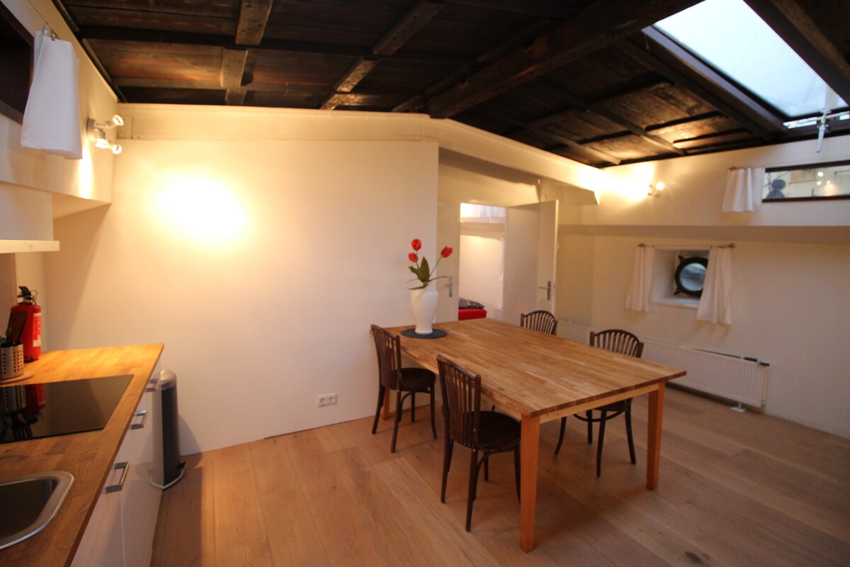 Aquest bonic apartament es troba en una barca de càrrega de 1907 a l'antic port d'Amsterdam del segle XVI. El vaixell està atracat entre la part més antiga del centre històric de la ciutat i l'arquitectura moderna de l'illa Oosterdok, entre l'Estació Central i el Museu tecnològic. El vaixell i els vaixells que l'envolten formen un poblet al centre de la ciutat. La calefacció central fa que l'apartament sigui agradable i càlid a l'hivern.