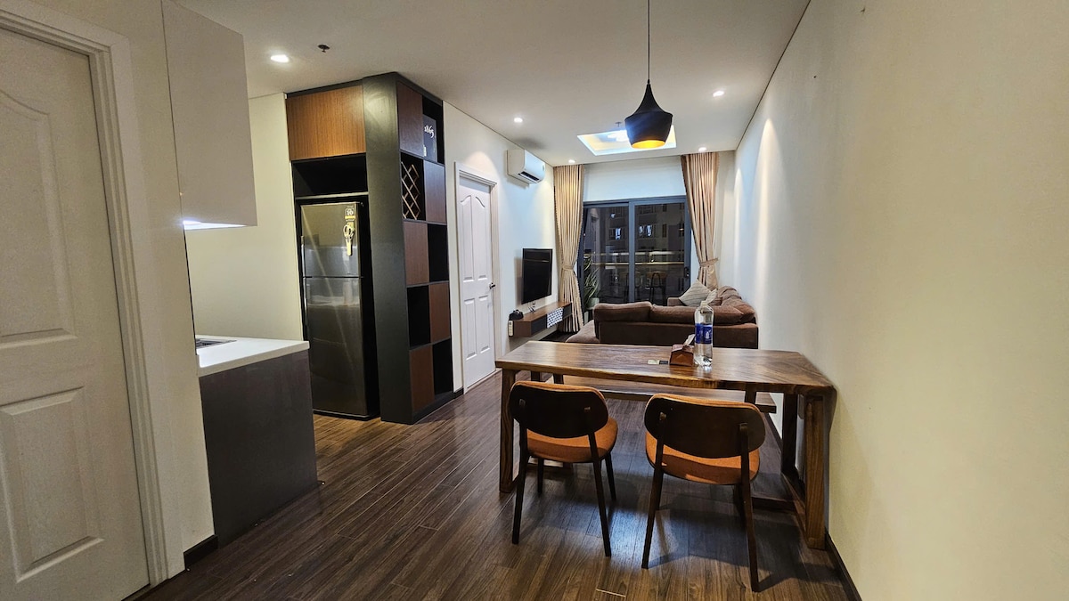 Situat a la planta 27 de Monarchy, aquest apartament de 80 m² combina unes vistes panoràmiques del perfil urbà de Da Nang i del pont del Drac amb la comoditat de la llar. Amb un estil de fusta natural, detalls de rotang i tons verds suaus, és un refugi serè per a estades llargues. Cuina en una cuina totalment equipada, aprofita la bugaderia de l'apartament, gaudeix de l'accés a la piscina de l'edifici després d'un dia de feina o d'exploració. Amb cafeteries, mercats i camins a la vora del riu a pocs passos, aquesta residència combina comoditat, oci i confort per a estades llargues.