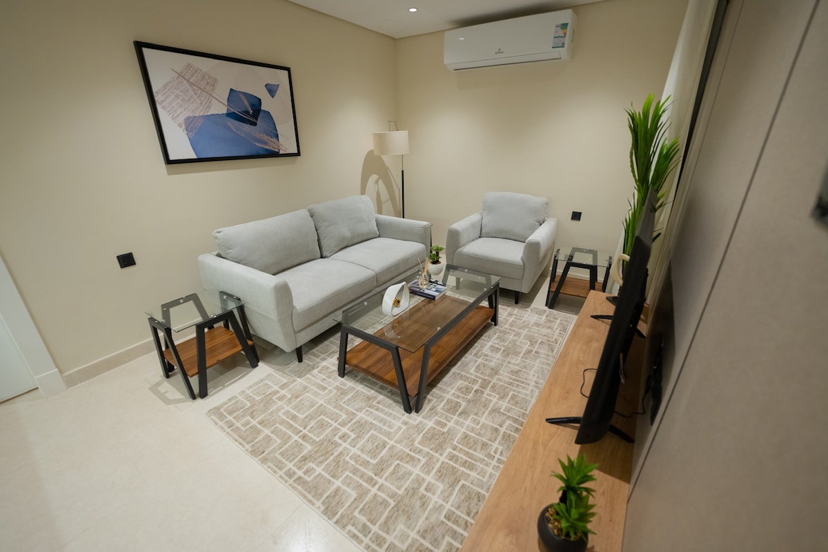 Benvinguts al nostre apartament, que us ofereix una estada excepcional que supera les vostres expectatives. L'apartament conté un dormitori equipat amb els millors matalassos, a més d'un saló independent amb sofàs còmodes amb una pantalla intel·ligent de 65 polzades per gaudir (Netflix, Shahid, BeIN) + Wi-Fi. La cuina està totalment equipada per satisfer totes les vostres necessitats. Hi ha una zona exterior amb un disseny rural i una vista privilegiada del centre financer, ideal per a esdeveniments i reunions amb familiars i amics. L'apartament està equipat per a estades curtes i llargues. La ubicació és fantàstica al cor de la ciutat, a prop de llocs d'interès, serveis i restaurants.