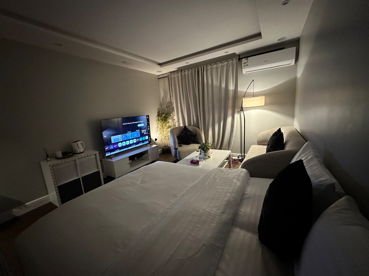 Un luxós estudi ✨ amb un disseny hoteler sofisticat a la ciutat septentrional de Riad, que proporciona una sensació de tranquil·litat i privacitat en un entorn elegant i còmode, amb una entrada independent que et permet accedir-hi fàcilment i amb total comoditat. Equipat amb mobles de luxe, cafè distintiu i hospitalitat, amb alts estàndards de neteja hotelera. Inclou tot el que necessites per a la teva higiene diària: compreses, ambientador, gel de dutxa, xampú i Sleeper per a una experiència completa en tots els detalls. La ubicació és a prop de cafeteries, restaurants i serveis vitals per viure moments de luxe amb un caràcter còmode i elegant. 🌿