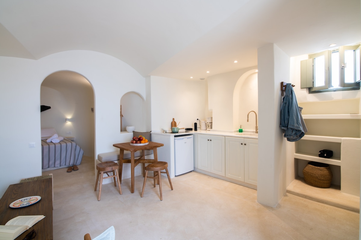 Les coves d'Antonio són un exemple típic de l'arquitectura de Santorini. Construït el 1901, inicialment es va utilitzar com a celler de preparació de vins de la casa cova i una pastisseria construïda directament a la roca volcànica. El 2020 es va renovar completament i es va convertir en 3 suites autònomes que comparteixen un pati comú Situat al poble tradicional de Megalochori, a dos minuts a peu de la pintoresca plaça del poble