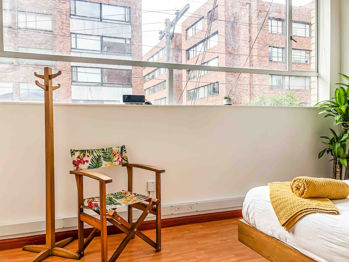 A chic & petite studio in one of the most central, safe, and trendy sections of Chapinero - the best neighborhood in Bogotá for foodies and the heart of the creative community. Enjoy an open living space with huge windows, projector w/ Netflix, and fibre optic internet. 1-block from shared biking station, Zona G, Quinta Camacho, and Chapinero Alto. The neighborhood is 🏳️🌈 friendly