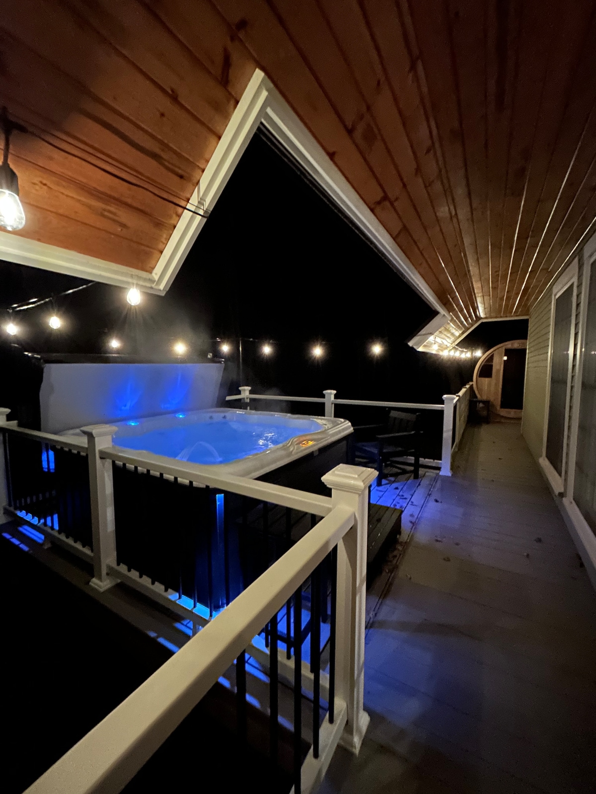 Caseta moderna amb bany termal a l'aire lliure en una granja de Vermont