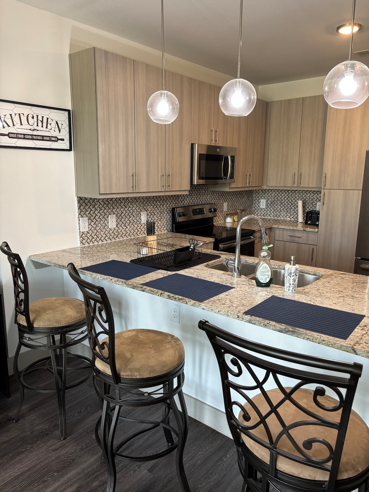 Beautiful home with everything needed to feel right at home. Kitchen fully equipped with all essentials to prepare meals. Kitchen overlooks the living area which features a 70 inch TV. After soaking in the garden tub, relax in the king size temperpedic in master bedroom. The guest bedroom features a comfy queen bed. The patio area is ready for grilling. Minutes away from the NEW Grandscape, The Star in Frisco, Legacy West, Toyota headquarters, and countless other restaurants and entertainment.