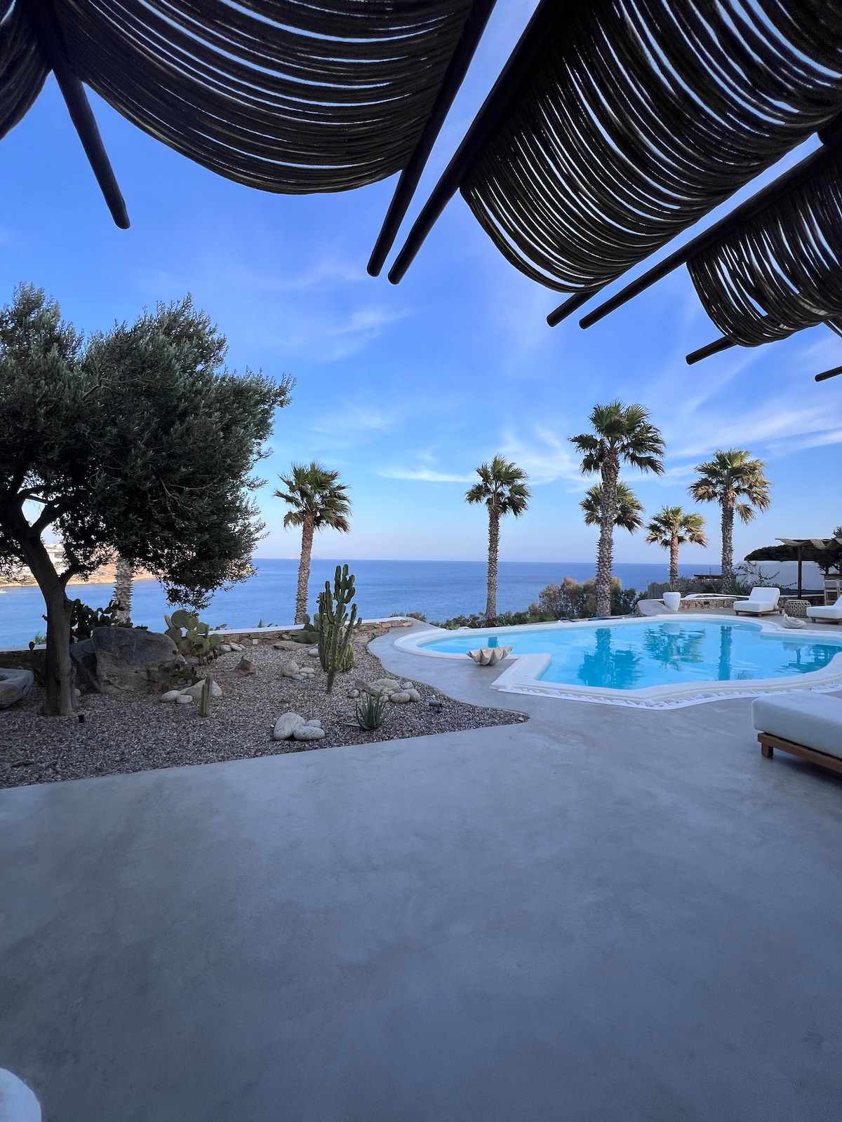 Elegant Cycladic studio, infinity pool and panoramic seaviews Sleeps 2–4 guests Welcome to the Nike Suite, a beautifully designed 48 m² open-plan residence, perched above the iconic Super Paradise Beach. With direct access to the large infinity pool and uninterrupted views of the Aegean Sea, as well as a fully furnished pergola-shaded area with dining table and lounge sofa, this suite offers a relaxed yet luxurious island experience for couples or small families.