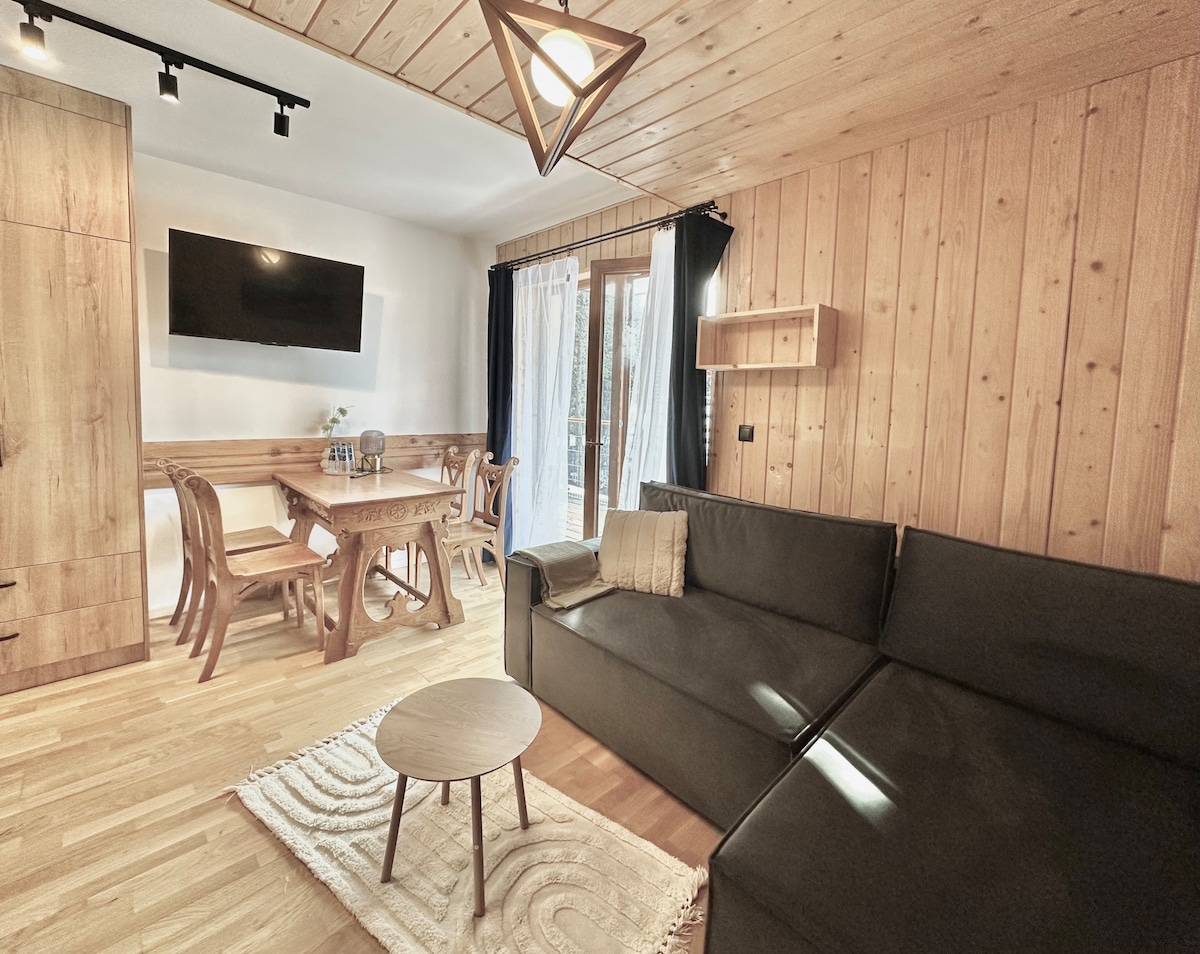 Aquest apartament d'1 dormitori es troba a 600 metres de la parada principal d'autobús de Zakopane. El lloc perfecte per explorar Zakopane i els voltants. Hi ha un llit doble al dormitori amb un còmode sofà llit doble a la sala d'estar. Cuina independent i bany amb dutxa. Grans vistes des del balcó, però just al centre de la ciutat. Botigues, estació d'autobusos, carrer principal, tot a poca distància a peu. Televisor intel·ligent (aplicacions de Netflix i Prime, però necessites les teves credencials per mirar-les). Lloc perfecte durant tot l'any.