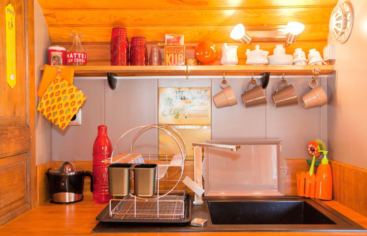 Le logement est une véritable roulotte de collection immatriculée, sur un terrain privatif entouré de murs de pierres sèches et d'arbres. L'intérieur est tout en bois, climatisé, avec une grande baignoire dans la salle de bain. Sur le terrain il y a un coin repas sous les chênes, un barbecue, hamac, balancelle, bains de soleil, coin apéro. Le tout entouré de montagnes, à 2 mn à pied de la rivière, à une demie heure de la mer.