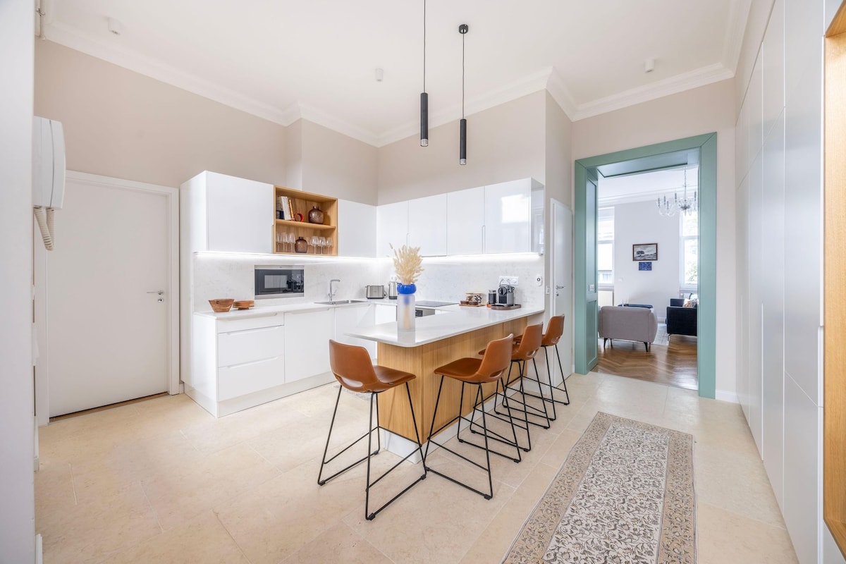 El nostre pis es troba al centre històric de Budapest, just a l'interior del nostre bulevard, al nord. L'edifici es va construir el 1889 i ara està en bones condicions. L'apartament té la màxima qualitat en tots els detalls. Equipament: wifi d'alta velocitat, televisor Samsung Smart SUHD"65" (Netflix,Youtube), canals per cable HD,rentadora,assecadora, planxa, penja-robes. Sistema d'aire condicionat de gamma alta Cuina: microones, fogons, placa calefactora d'inducció, rentaplats, nevera/congelador, cafetera Nespresso amb càpsules gratuïtes, escalfador d'aigua, torradora, estris de cuina, coberts, plats, gots. Banys: assecadors de cabells, tovalloles, sabó líquid. Dormitoris: TV per cable, televisor Samsung Smart"40" (Netflix,Youtube), roba de llit d'alta qualitat, llits de comoditat Springbox. Estem oberts a complir les sol·licituds especials. Quan arribis a l'adreça, t'estaré esperant a l'entrada principal de l'edifici i t'ajudaré amb l'equipatge. Després t'explicaré les coses més importants sobre el pis, els voltants i la ciutat. També puc ajudar-te amb el transport des i cap a l'aeroport o l'estació de tren. Tinc un servei de 24 hores quan tinc hostes. Durant la teva estada pots posar-te en contacte amb mi per telèfon, viber,whatsapp, missatger,en qualsevol moment. L'apartament es troba en un bulevard a la zona històrica del centre de Budapest, a prop de l'Òpera, la Basílica de Sant Esteve, l'edifici del Parlament hongarès, el centre comercial WestEnd i els famosos bars de ruïnes de la ciutat.