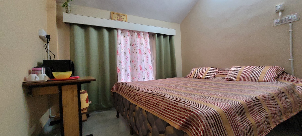 An entire private 3 bedroom at first floor with all amenities to give a feeling of being at home - well lighted spacious three fully furnished bedrooms, living room and attached bathrooms with 24 hrs hot and cold water, free WIFI and secured parking and large terrace for relaxation. The price is for three bedrooms on twin sharing basis with en suite bathroom. Extra bed if required for Rs 600/- per guest .Guests can enjoy veg Indian cuisine and can cook themselves.
