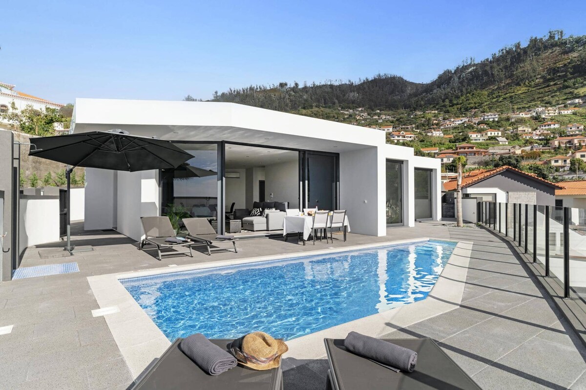 Moderna vil·la de 3 dormitoris a Arco da Calheta amb impressionants vistes al mar i a la muntanya. Disposa de piscina privada climatitzada, zona de barbacoa, cuina totalment equipada, wifi ràpid i garatge segur. Camina fins a uns quants restaurants, cafeteries i farmàcies. A només 10 minuts de Calheta Beach i a 30 minuts de Funchal. Ideal per a parelles, famílies (bressol i trona) o grups. A prop de les millors passejades de Levada. Còmode, espaiós i perfecte per explorar Madeira.