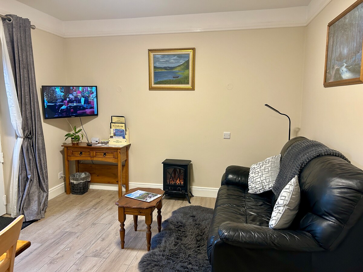 Aquest apartament d'un dormitori a la planta baixa (màxim 2 persones) es troba a Buttermilk Lodge, a només 5 minuts a peu de la ciutat de Clifden. És independent (sense àpats inclosos) i té una entrada privada, una sala d'estar i una cuina totalment equipada, amb cuina, vitroceràmica , graella, microones, rentadora assecadora, etc. El dormitori té molt d'emmagatzematge i un bany amb dutxa i vàter. Hi ha llençols, tovalloles i articles de bany personals. No hi ha nens menors de 12 anys.