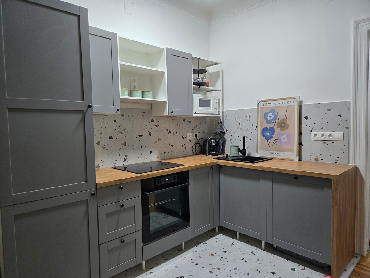 L'elegant apartament d'un llit enorme de 75 metres quadrats ha estat totalment renovat amb un disseny elegant en una casa preciosa de mitjans de segle. L'apartament es troba a la tercera planta amb ascensor en una zona molt tranquil·la de l'edifici. Situat en una de les zones més de moda de Budapest, amb els millors bars, pubs, restaurants, galeries, botigues de roba de disseny, botigues i arquitectura històrica a la teva porta. L'apartament té un dormitori, una sala d'estar, cuina totalment equipada i un bany.