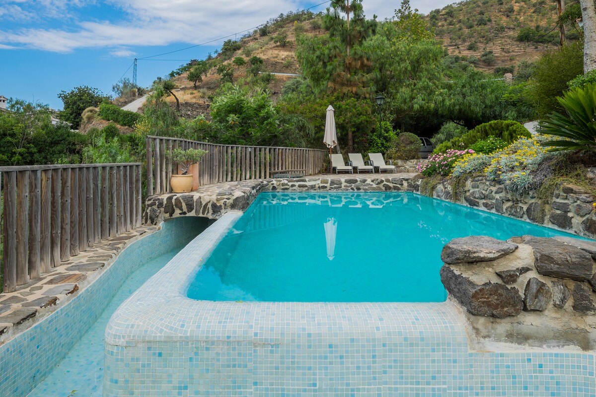 Acollidora casa familiar per a 2 famílies o 1 família nombrosa (8 persones + 2 bressols) amb piscina infinita privada (9x4m), climatitzada d'abril a octubre mitjançant panells solars. Boniques vistes de la vall de Vélez-Málaga i el mar Mediterrani. Casa de vacances ideal per a aquells que estimen una ubicació única, vistes al mar, natura, postes de sol i cels estrellats preciosos i, sobretot, tranquil·litat.
